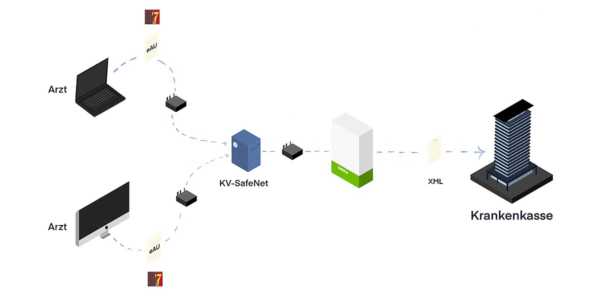 Auf dieser Grundlage wird seither die digitale AU auf Basis von HL7 sicher und komplett papierersetzend in Echtzeit aus der Arztpraxis übertragen.